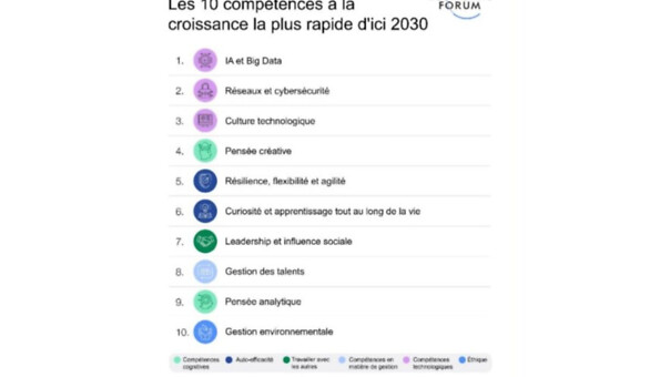 Toujours dans le nouveau rapport du WEF, on y projette les compétences qui seront les plus recherchées d’ici 2030. Outre les compétences technologiques qui arrivent en tête, les compétences cognitives, d’auto-efficacité et du savoir travailler avec les autres arrivent également en force.